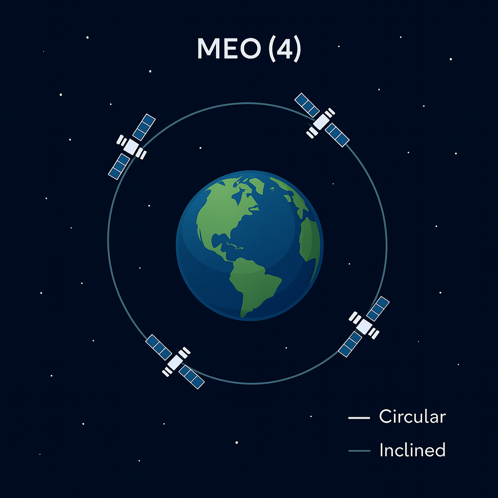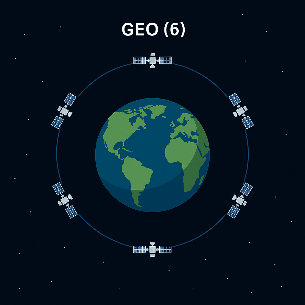 Layered mesh: LEO 12 • MEO 4 • GEO 3–6 for global reach